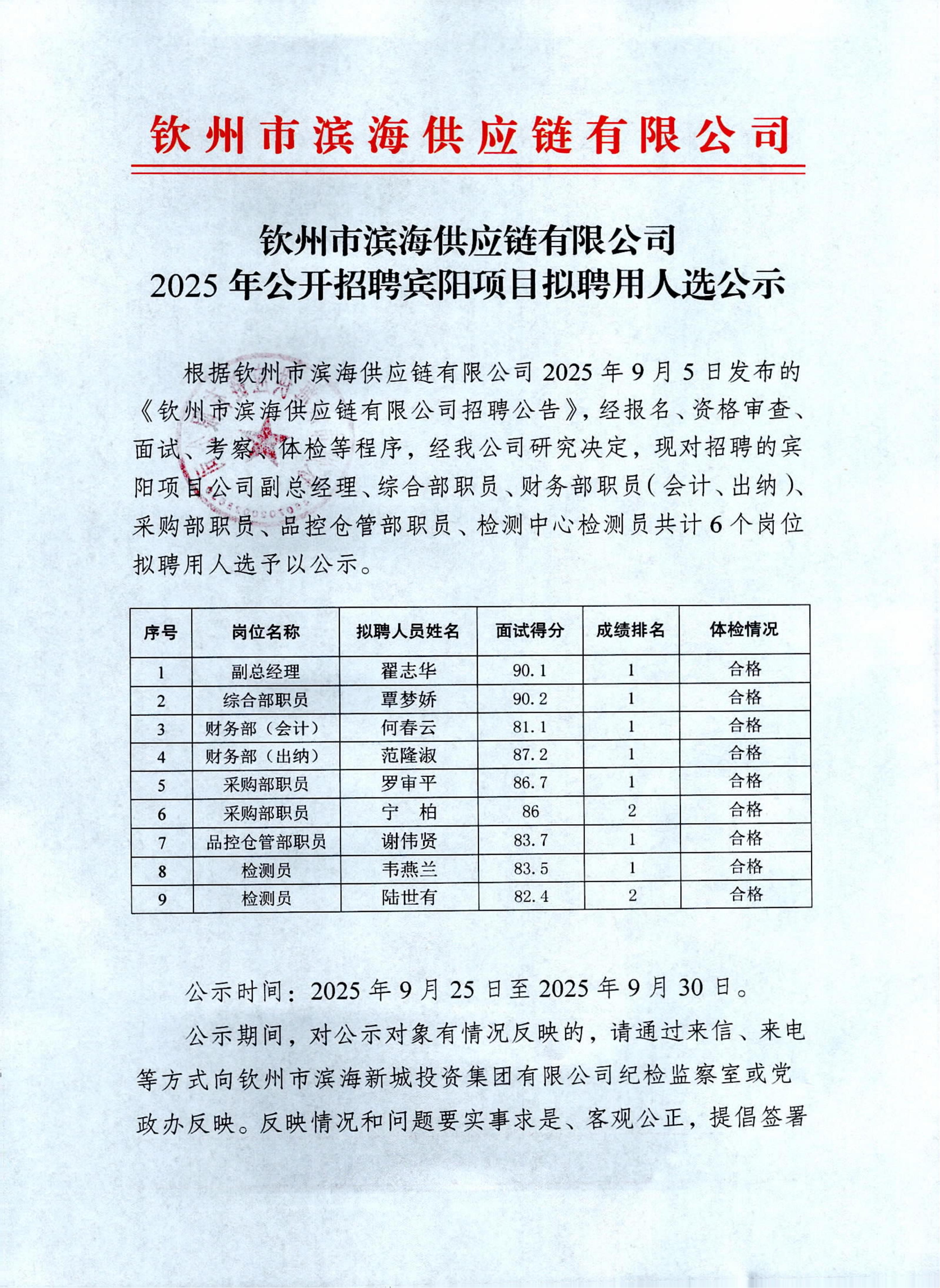 欽州市濱海供應(yīng)鏈有限公司2025年公開招聘賓陽項(xiàng)目擬聘用人選公示